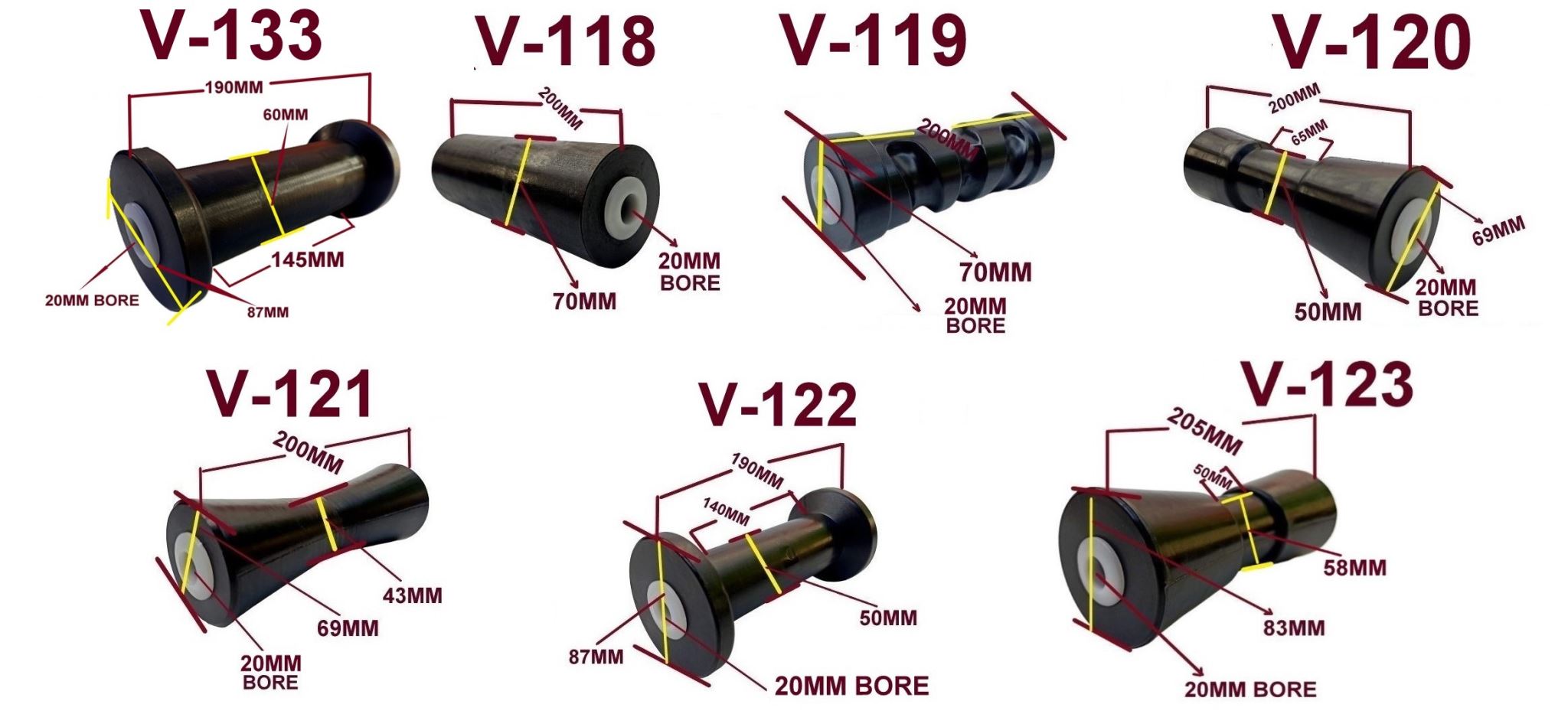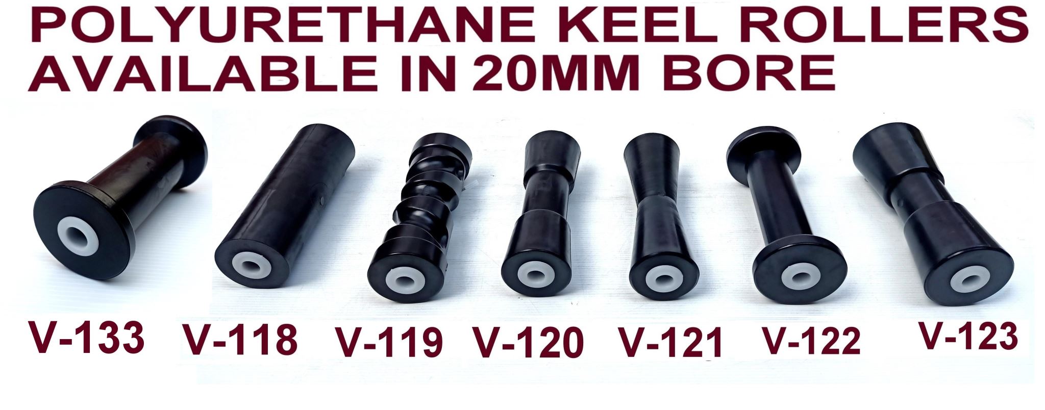1 X ROLLER PLEASE CHOOSE FROM V-133 OR V-118, OR V-119, OR V-120, OR V-121 OR V-122, OR V-123 ALL ROLLERS COMES WITH 20MM BORE AND NYLON BUSHES FOR SMOOTH ROLLING.